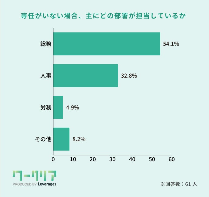また、障がい者雇用専任の担当が「いない」と回答した企業は約7割となり、他業務と兼務して担当をしている企業が多いようです。専任がいない場合、主にどこの部署が担当しているかを聞いたところ、「総務(54.1%)」がもっとも多く、次いで「人事(32.8%)」「労務(4.9%)」となりました。