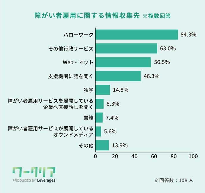 障がい者雇用に関する情報収集先で最も多かったのは「ハローワーク(84.3%)」となり、次いで「その他行政サービス(63.0%)」「ネット検索(56.5%)」と続きます。多くの企業が行政に頼っていることがわかりました。