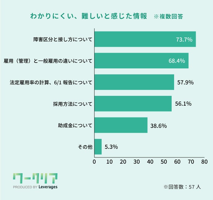 情報収集時に「わかりにくい」「難しい」と感じる情報が「ある」と回答した企業に対し、どの部分で難しかったのかを尋ねると「障がい区分と接し方(73.7%)」がもっとも多い結果となりました。次いで、「雇用(管理)と一般雇用の違い(68.4%)」「法定雇用率の計算、6/1報告(57.9%)」と続きます。※複数回答