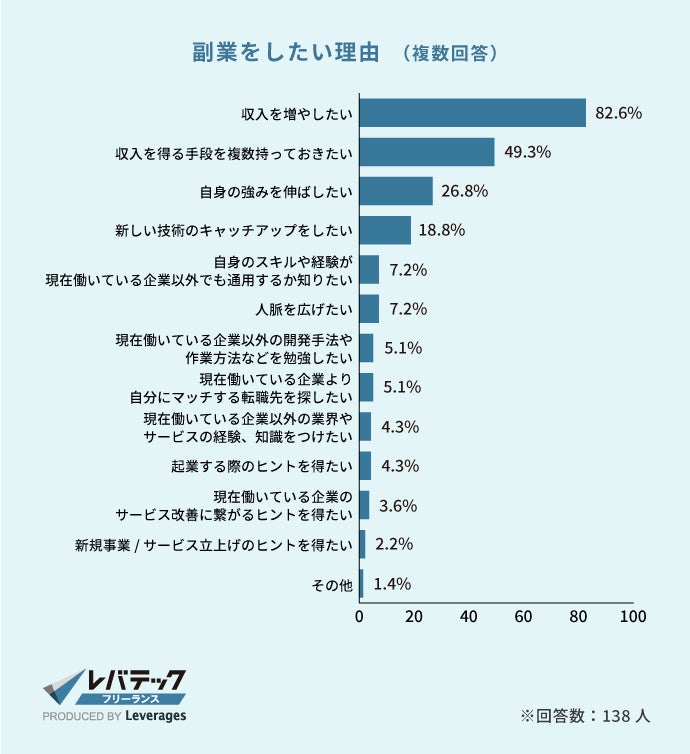 副業をしたい理由で最も多いのは「収入を増やしたい(82.6%)」となり、次いで「収入を得る手段を複数持っておきたい(49.3%)」「自身の強みを伸ばしたい(26.8%)」と続きます。