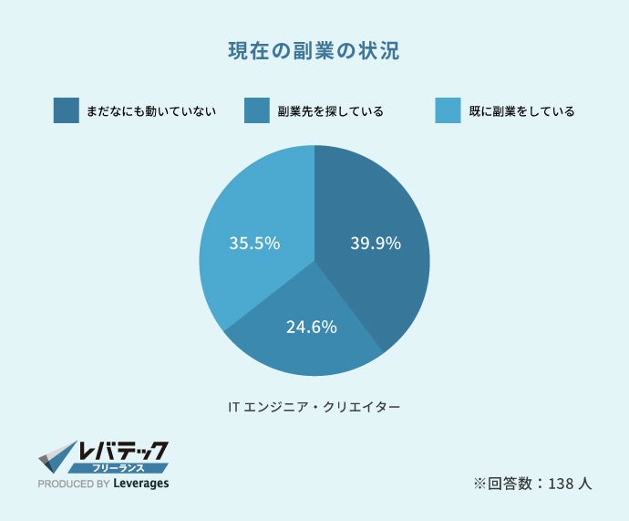 副業をしたいと回答した人のうち、約6割のITエンジニア・クリエイターが「既に副業をしている(35.5%)」「副業先を探している(24.6%)」と回答しました。