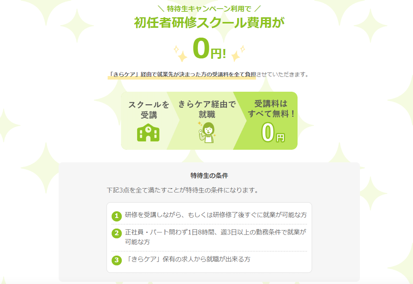 一定の条件を満たすと、特待生として初任者研修スクール費用が無料になります。