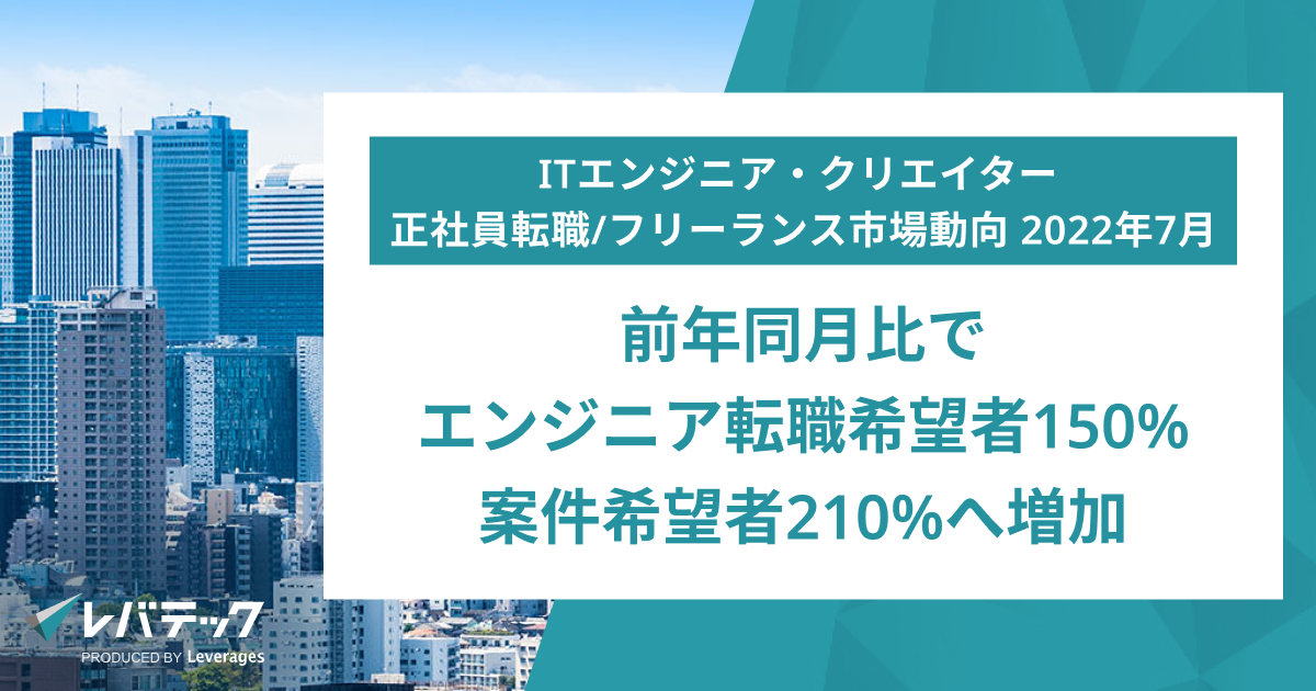 レバテック株式会社が運営するITエンジニア・クリエイター専門エージェント レバテック ( https://levtech.jp/ )は、「ITエンジニア・クリエイター正社員転職・フリーランス市場動向 2022年7月」を発表します。
