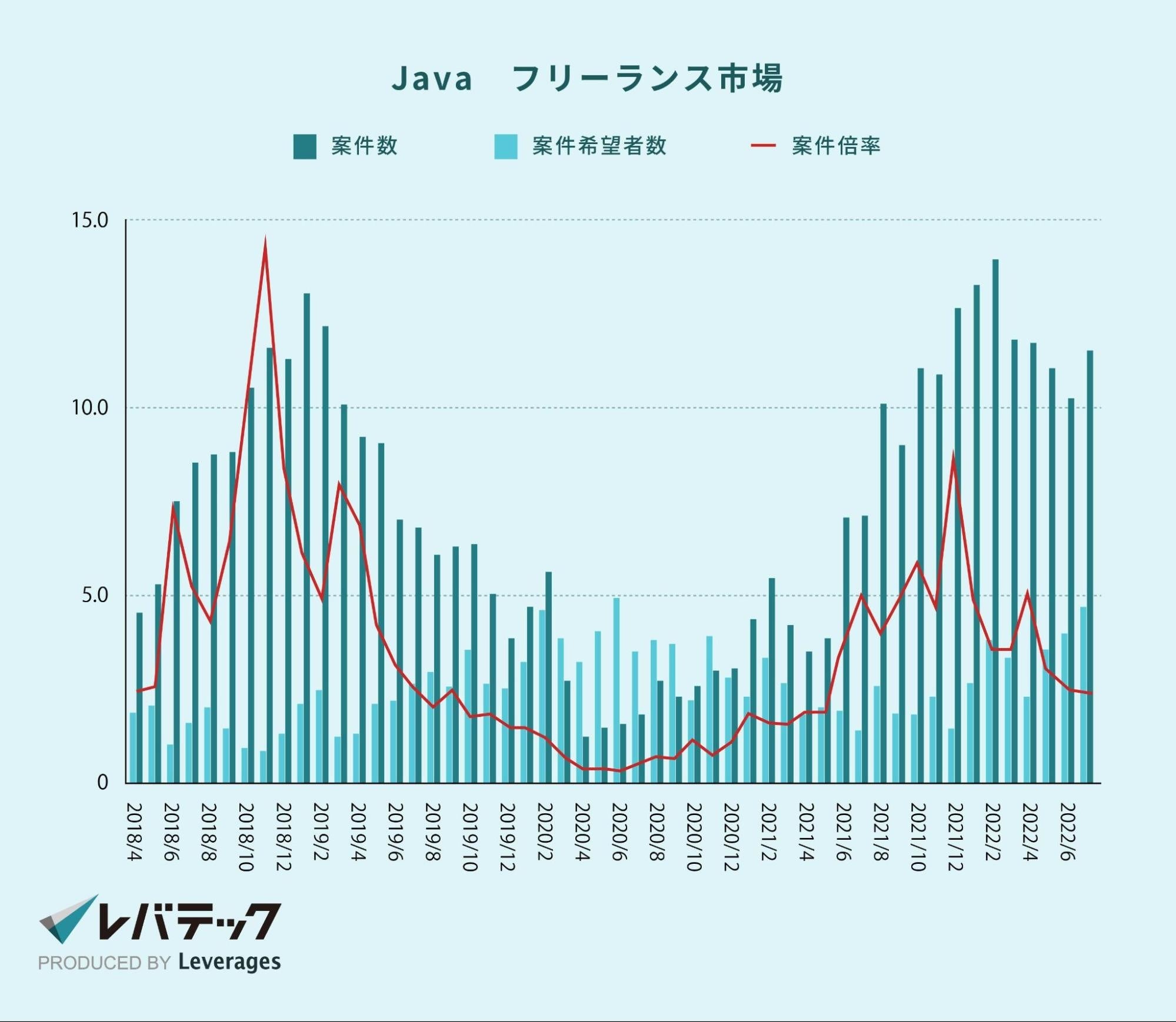 中でも、「Java(BtoB)」の案件倍率は21年12月を境に減少が続いています。
