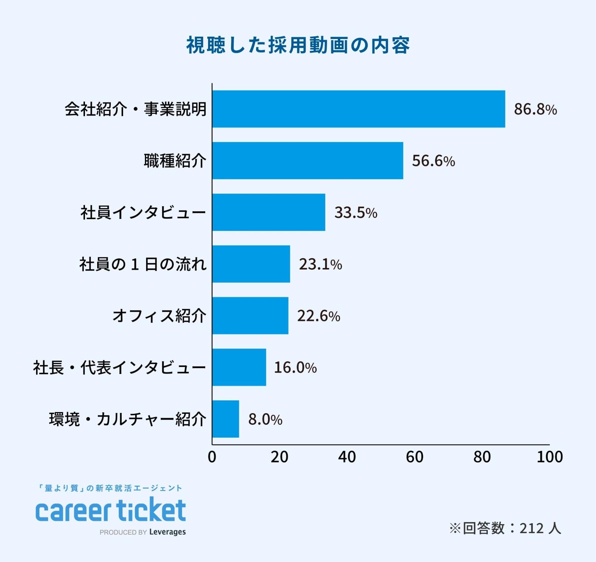 視聴した採用動画の内容は、「会社紹介・事業紹介(86.8%)」「職種紹介(56.6%)」が上位に入っています。企業紹介系の動画内容が上位に入っていることから、企業は説明会などで、学生により具体的に入社後のイメージをつけてもらうために採用動画を活用していることが伺えます。