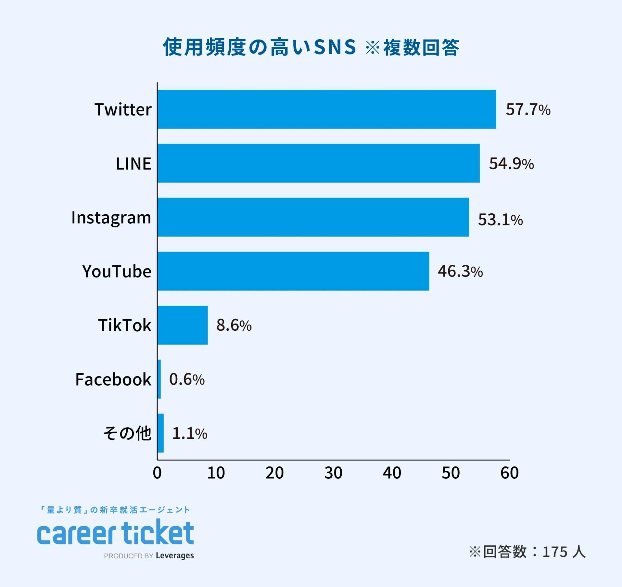 「はい」と回答した学生に活用しているSNSを尋ねると、「Twitter」「LINE」「Instagram」が上位に。昨年の同調査では「YouTube」が3番手でしたが、今回は「Instagram」が3位に入っています。これは、「YouTube」よりも「Twitter」や「Instagram」のほうが発信が手軽で更新性が高く、就活生の目にも留まりやすいことが要因の1つとして考えられます。
