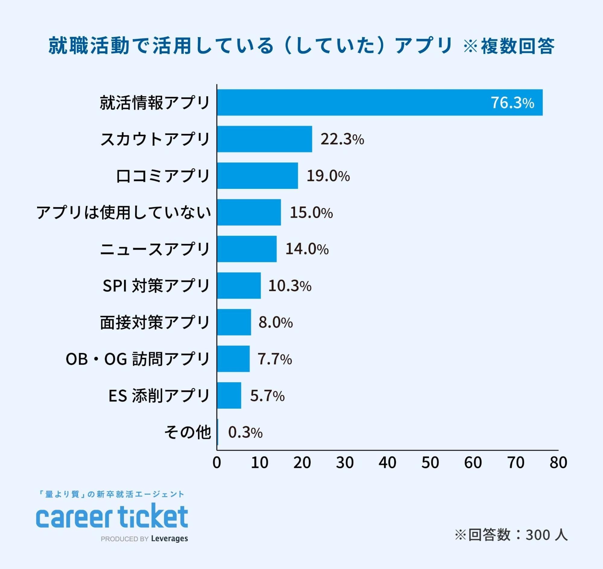 就職活動で活用しているアプリは、リクナビやマイナビなどの「就活情報アプリ(76.3%)」を除くと、「スカウトアプリ(22.3%)」が2位という結果になりました。