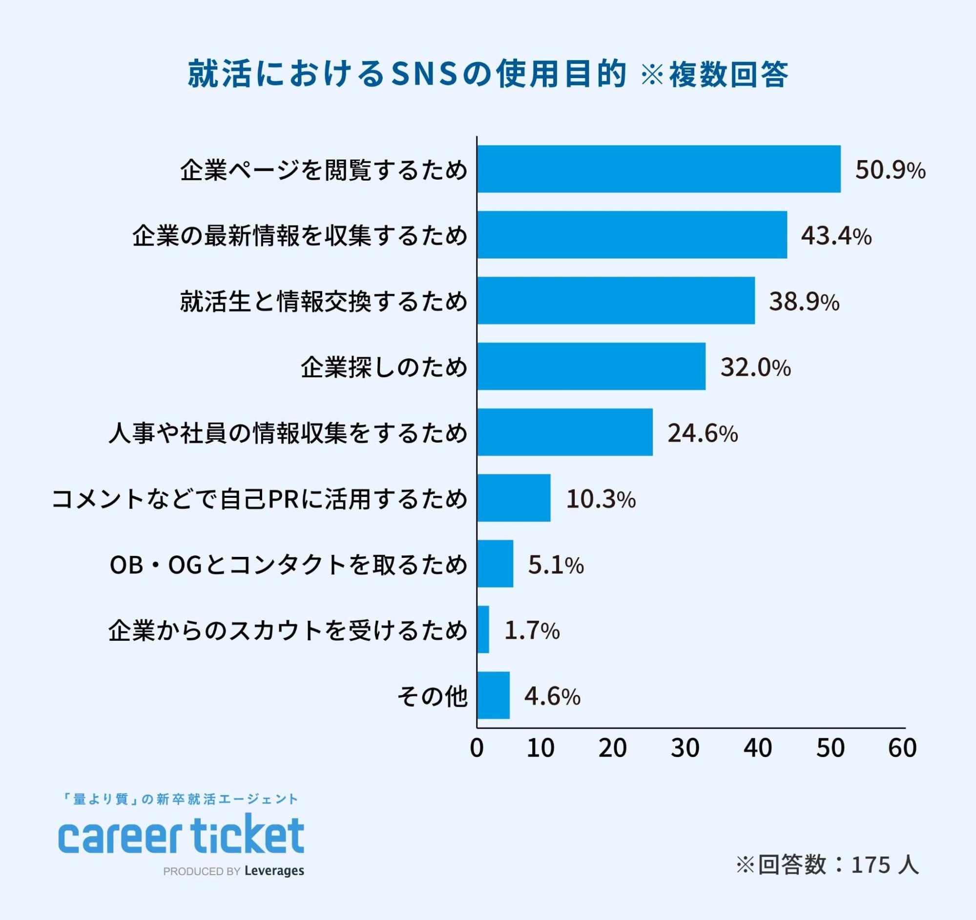 就職活動におけるSNSの利用目的に関しては、「企業ページを閲覧するため(50.9%)」「企業の最新情報を収集するため(43.4%)」「就活生と情報交換するため(38.9%)」と、主に情報収集のためにSNSを活用している学生が多いことがわかりました。