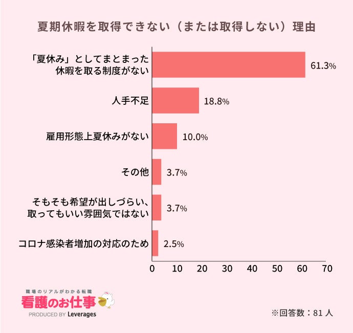 「夏期休暇を取得できない」理由は、「そもそも夏期休暇制度がない(61.3%)」という回答が最も多く、次に医療現場で慢性化している「人手不足(18.8%)」と続きます。