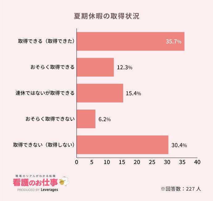レバレジーズメディカルケア株式会社が運営する、看護業界に特化した人材サービス『看護のお仕事』( https://kango-oshigoto.jp/ )は、看護師227人を対象に「夏期休暇取得の実態調査」を実施しました。