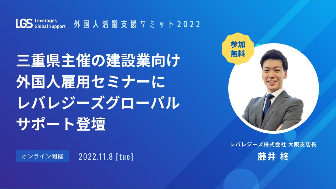 今回は三重県の事業者向け外国人雇用セミナー「【第5回】建設事業者必見!技能実習から特定技能への変更・採用」に登壇し、今後ますます重要度が上がっていく特定技能制度の現在状況と今後の制度方向性について、レバレジーズグローバルサポートから現場の最新状況や制度の変更点を踏まえて解説していきます。外国人の雇用に関して理解を深めて今後の採用に活かしていただきたいと考えています。
