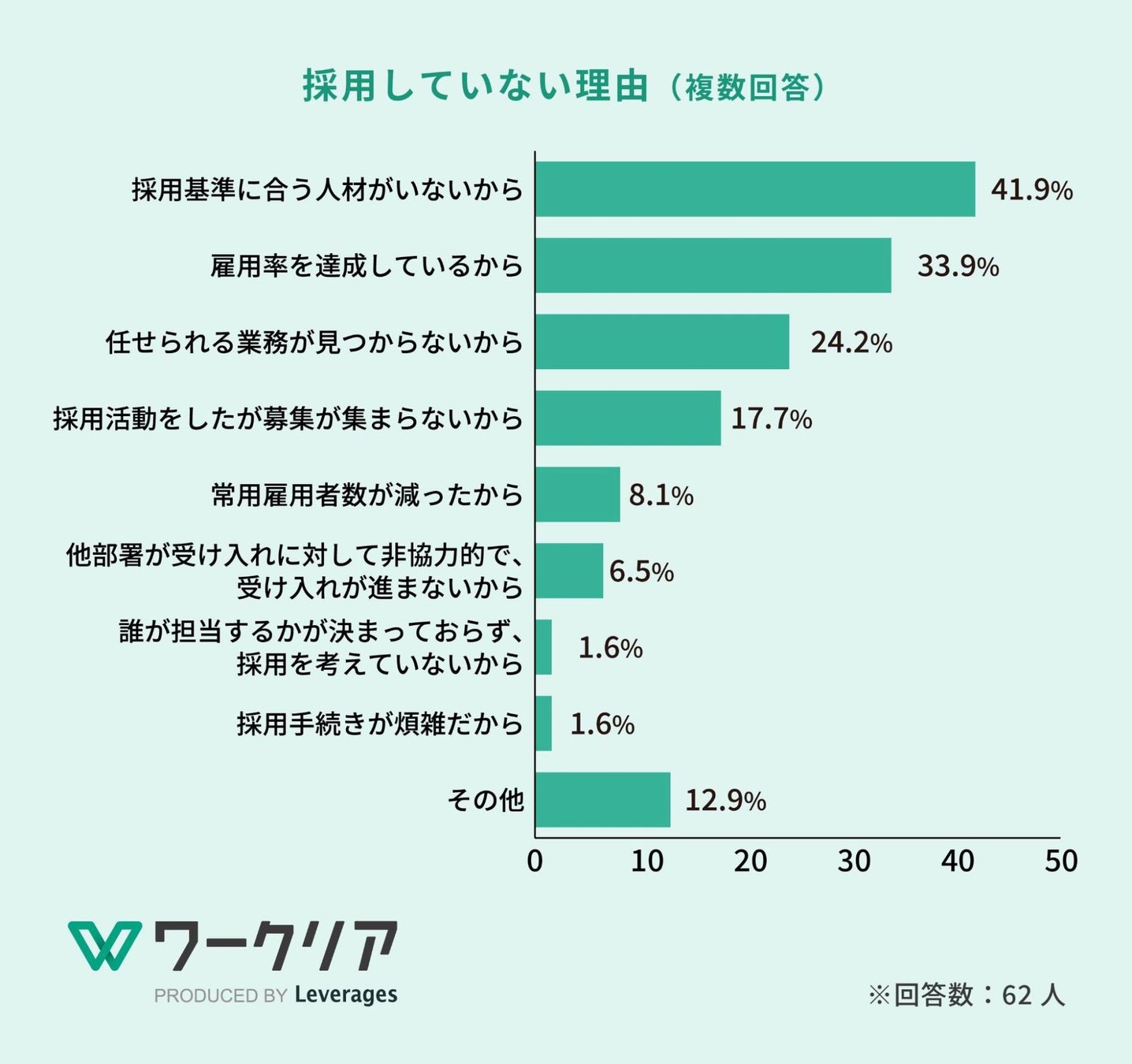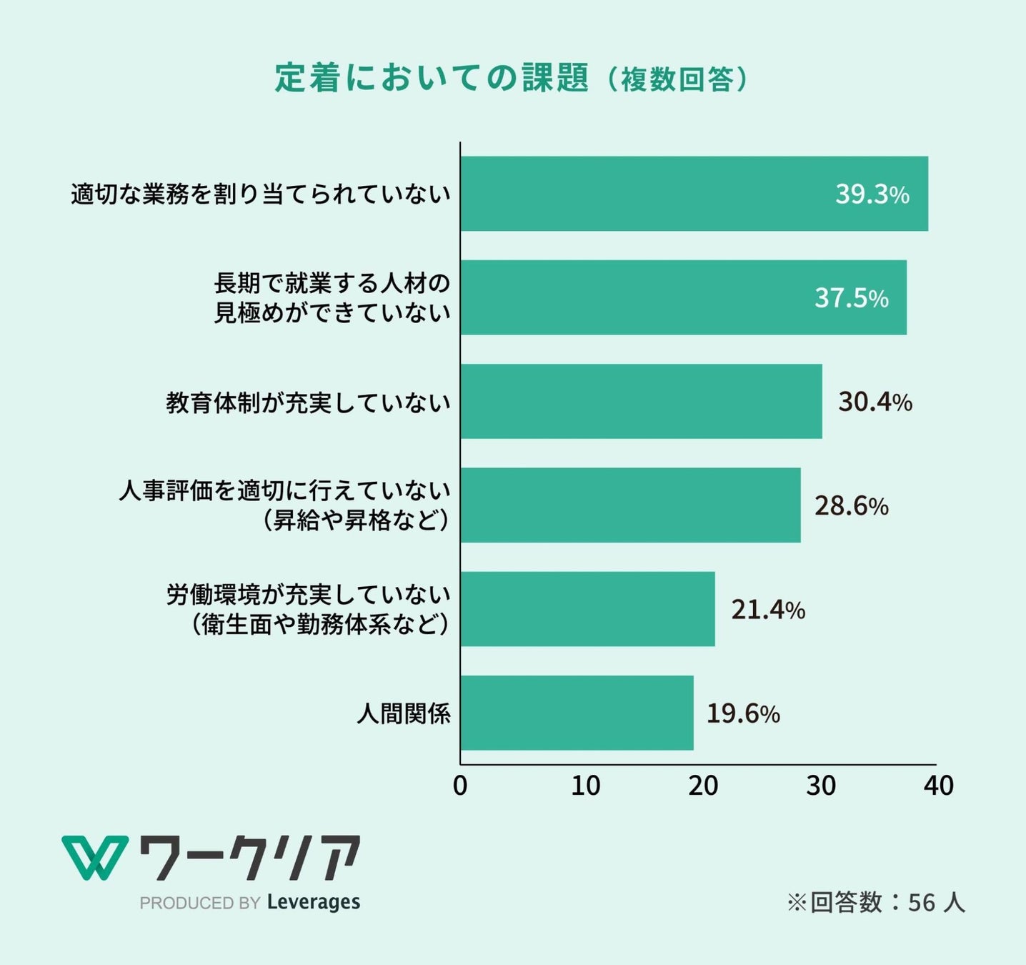 反面、計画通りに雇用が進んでいない企業の課題として多くあげられたのが「適切な業務を割り当てられていない(39.3%)」、次いで「長期で就業する人材の見極めができていない(37.5%)」、「教育体制が充実していない(30.4%)」となりました。それぞれの項目に大きな差はなく、企業によっての課題感は異なることが見受けられます。