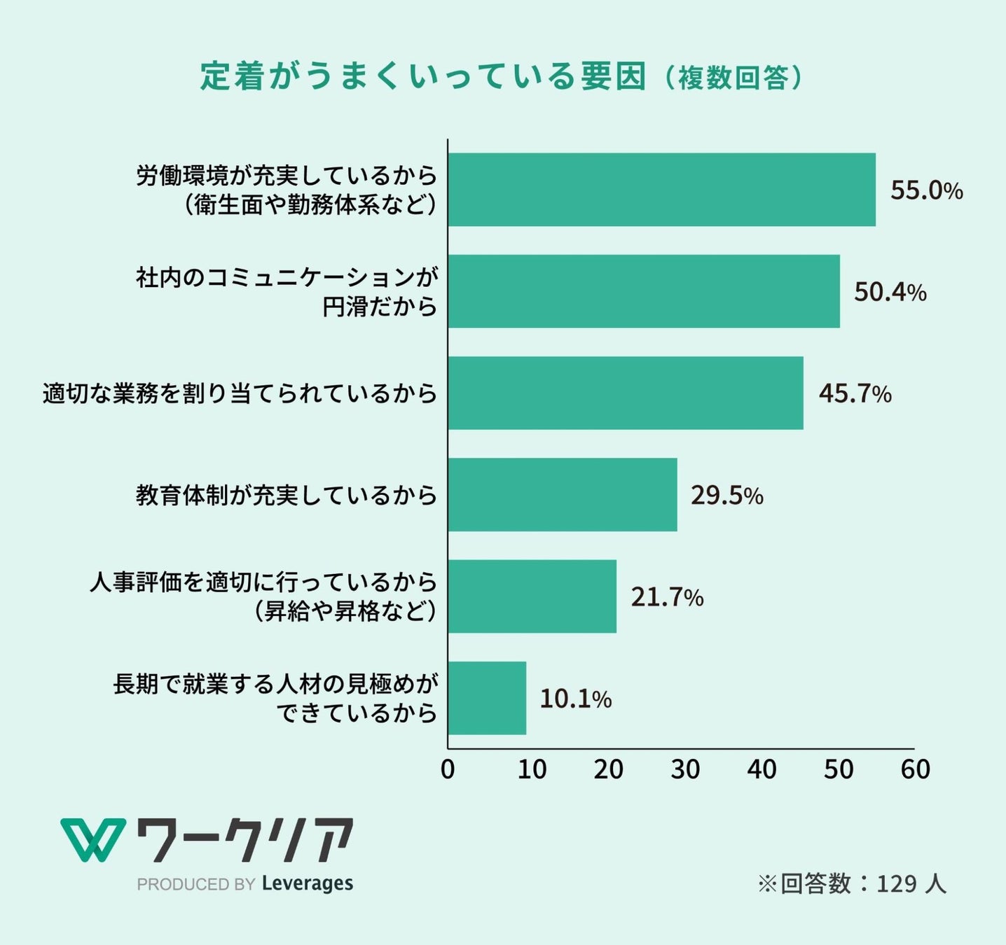 計画通りに雇用が進んでいる企業において、定着が上手くいっている要因として「労働環境が充実している(55.0%)」が最多となり、次いで「社内のコミュニケーションが円滑だから(50.4%)」、「適切な業務を割り当てられている(45.7%」)と続きます。