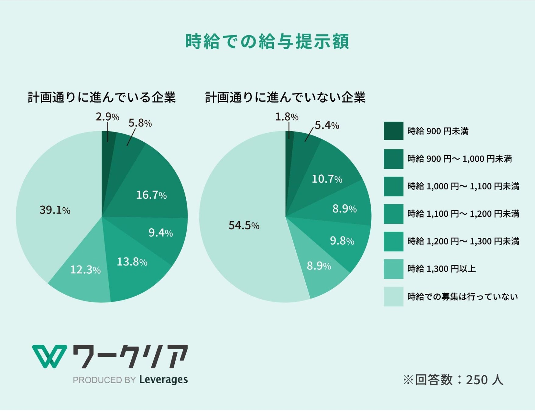 障がい者雇用が計画通りに進んでいない企業は、計画通りに進んでいる企業と比べて「時給での募集を取り入れていない」割合が高くなっています。さらに、月給の提示額も、計画通りに進んでいる企業と比較して金額がやや高いことから、採用ハードルが高くなっている可能性が考えられます。