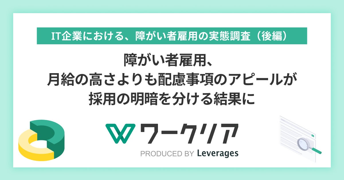 レバレジーズ株式会社が運営する、障がい者就労支援サービス「ワークリア(https://worklear.jp/partner/ )」は、障がい者雇用に関わるIT企業の採用担当者250社を対象に、障がい者雇用の実態調査を実施しました。今回は前編・後編に分かれた発表となり、本記事では「IT企業における障がい者雇用の実態調査」の後編として、お届けいたします。