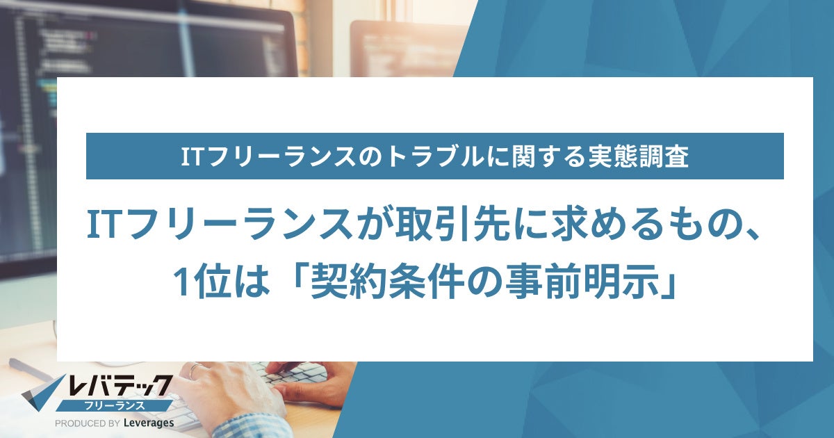 レバテック株式会社が運営するITエンジニア・クリエイター専門エージェント、 レバテックフリーランス( https://freelance.levtech.jp/ )は、ITフリーランス200名を対象に、取引先とのトラブルに関する実態調査を実施しました。今回はITフリーランス編を発表いたします。