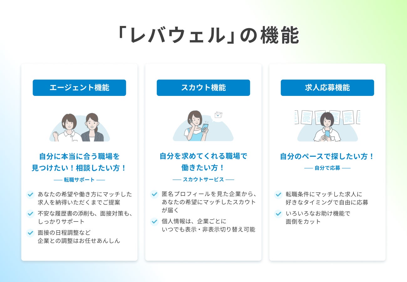 「レバウェル」は、エージェント機能・スカウト機能・求人応募機能の3つの機能を備えています。