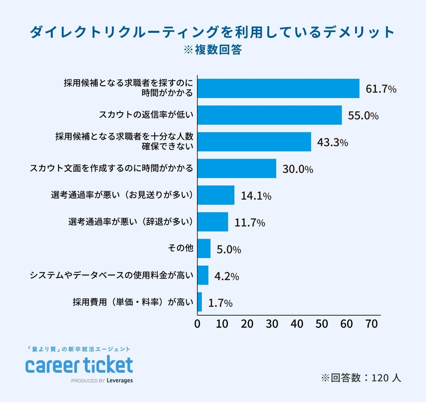 ダイレクトリクルーティングのデメリットとしては、6割以上が「採用候補となる求職者を探すのに時間がかかる(61.7%)」、3割が「スカウト文面を作成するのに時間がかかる(30.0%)」と回答しました。企業は「時間」についてデメリットを感じていることがわかります。