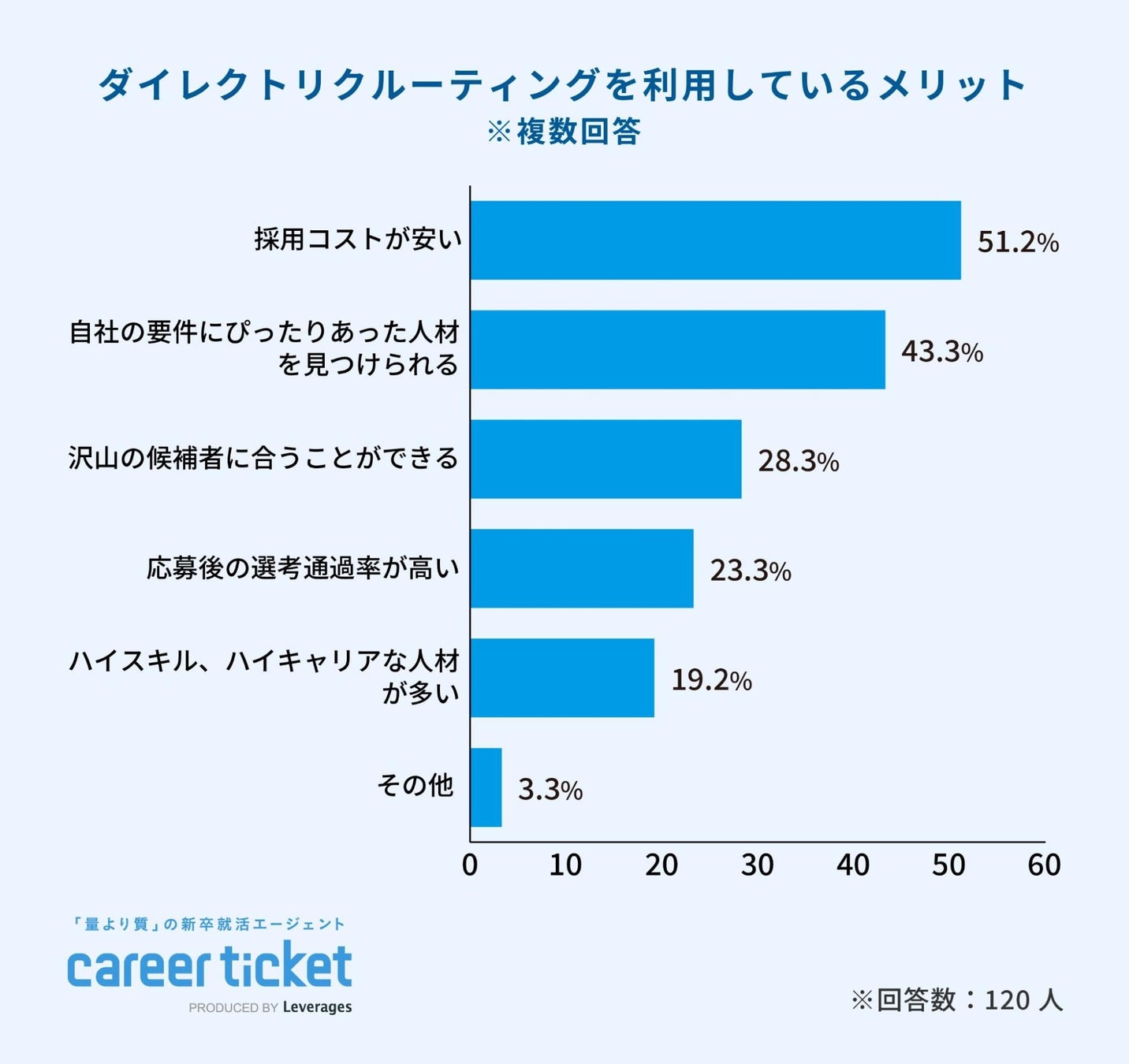 ダイレクトリクルーティングを利用しているメリットとしてもっとも多かったのは、「採用コストが安い(51.2%)」でした。次いで、「自社の要件にぴったりあった人材を見つけられる(43.3%)」と続きます。