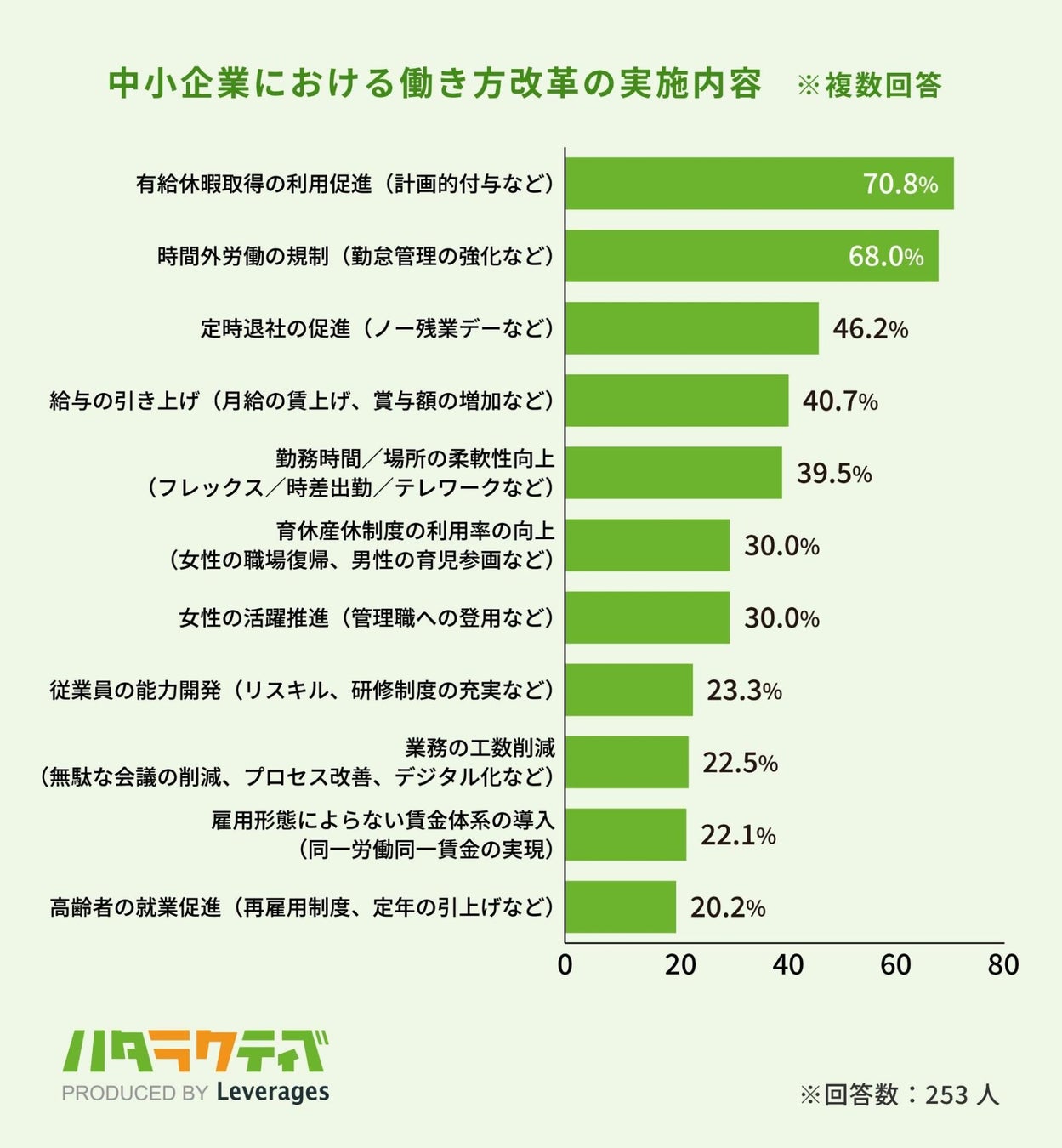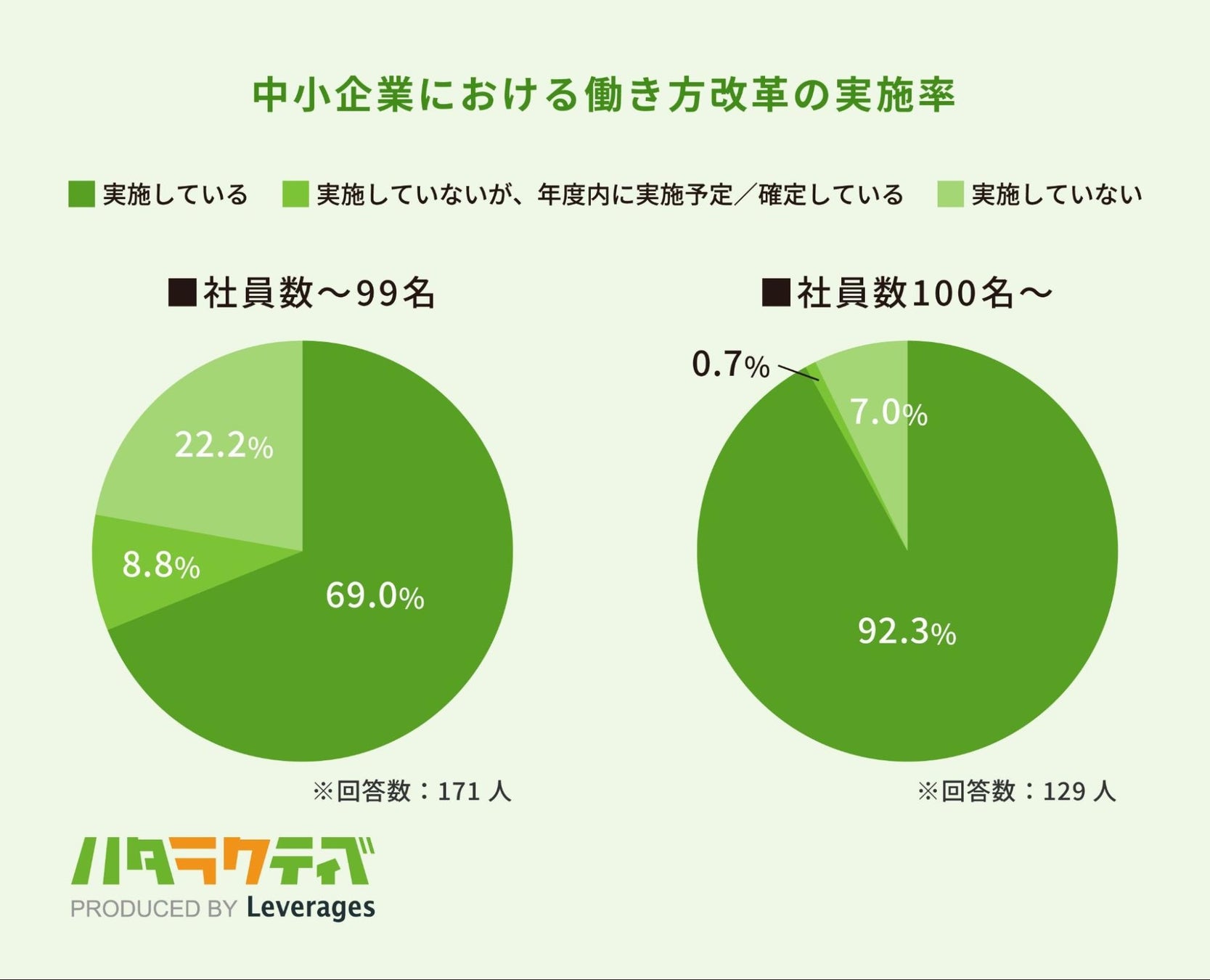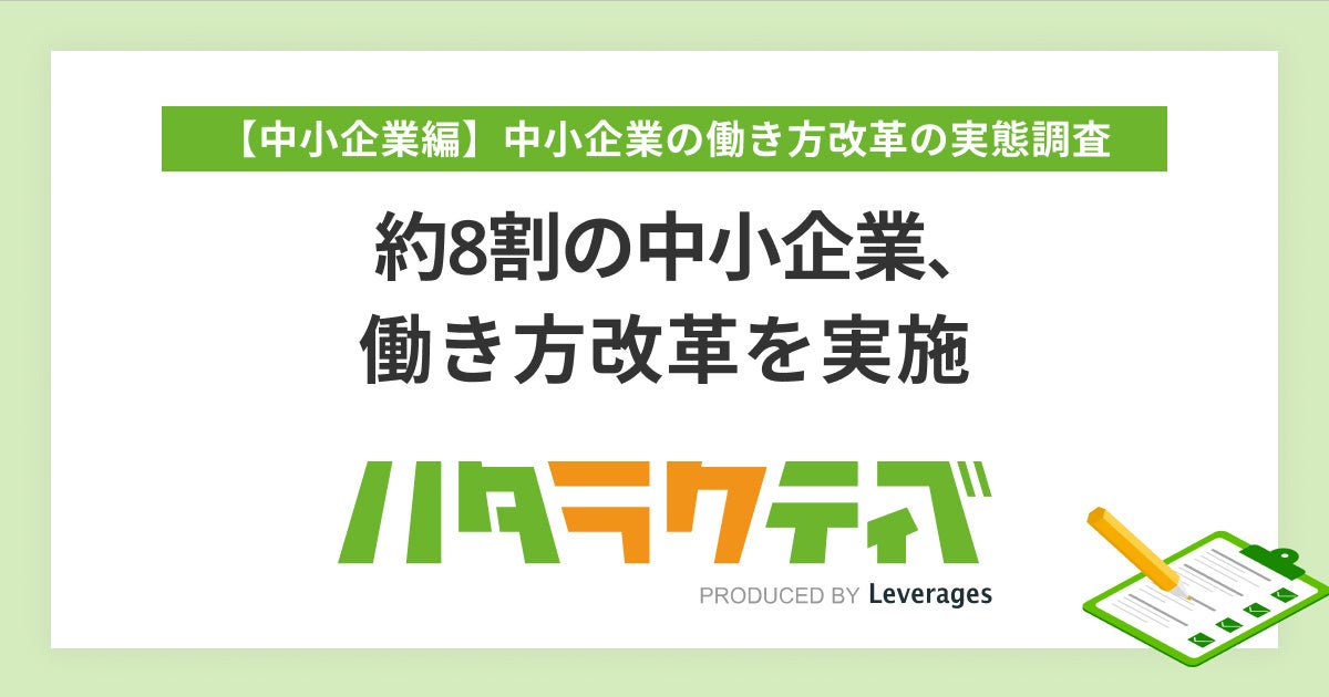 レバレジーズ株式会社が運営するフリーター・既卒・第二新卒向け就職支援サービス ハタラクティブ( https://hataractive.jp/ )は、中小企業の働き方改革担当者300名を対象に、働き方改革の実態を調査いたしました。本調査は企業編・社員編に分けた発表となり、今回は企業編をお届けします。*1 本調査において中小企業の定義は、従業員数500名未満の企業とする