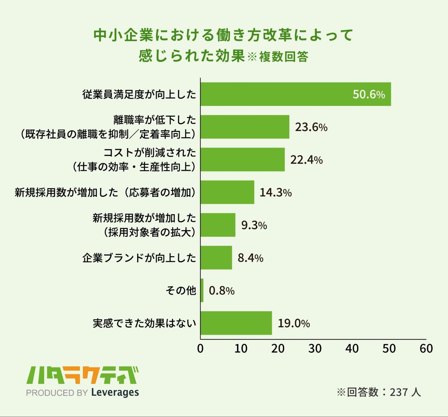 約8割の企業は働き方改革を行ったことで何らかの効果を感じています。全体のうち約半数の企業が「従業員満足度が向上した(50.6%)」と回答しました。過半数の企業が働き方改革の効果を感じる半面、全く効果を感じられていない企業は約2割におよびました。