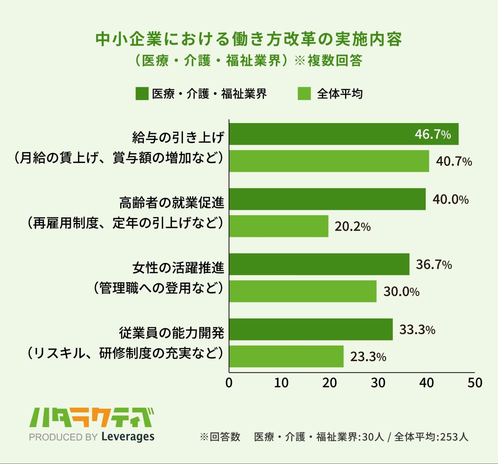 業界ごとの取り組み内容を見ると、医療・介護・福祉では「給与の引き上げ(46.7%)」「高齢者の就業促進(40.0%)」「女性の活躍推進(36.7%)」「従業員の能力開発(33.3%)」の項目で平均より5~10ptほど高い回答となりました。各業界の動向や課題によって差があり、特に人手不足の業界では取り組める内容に限りが出やすく、事実上の制限になり得ると推測できます。