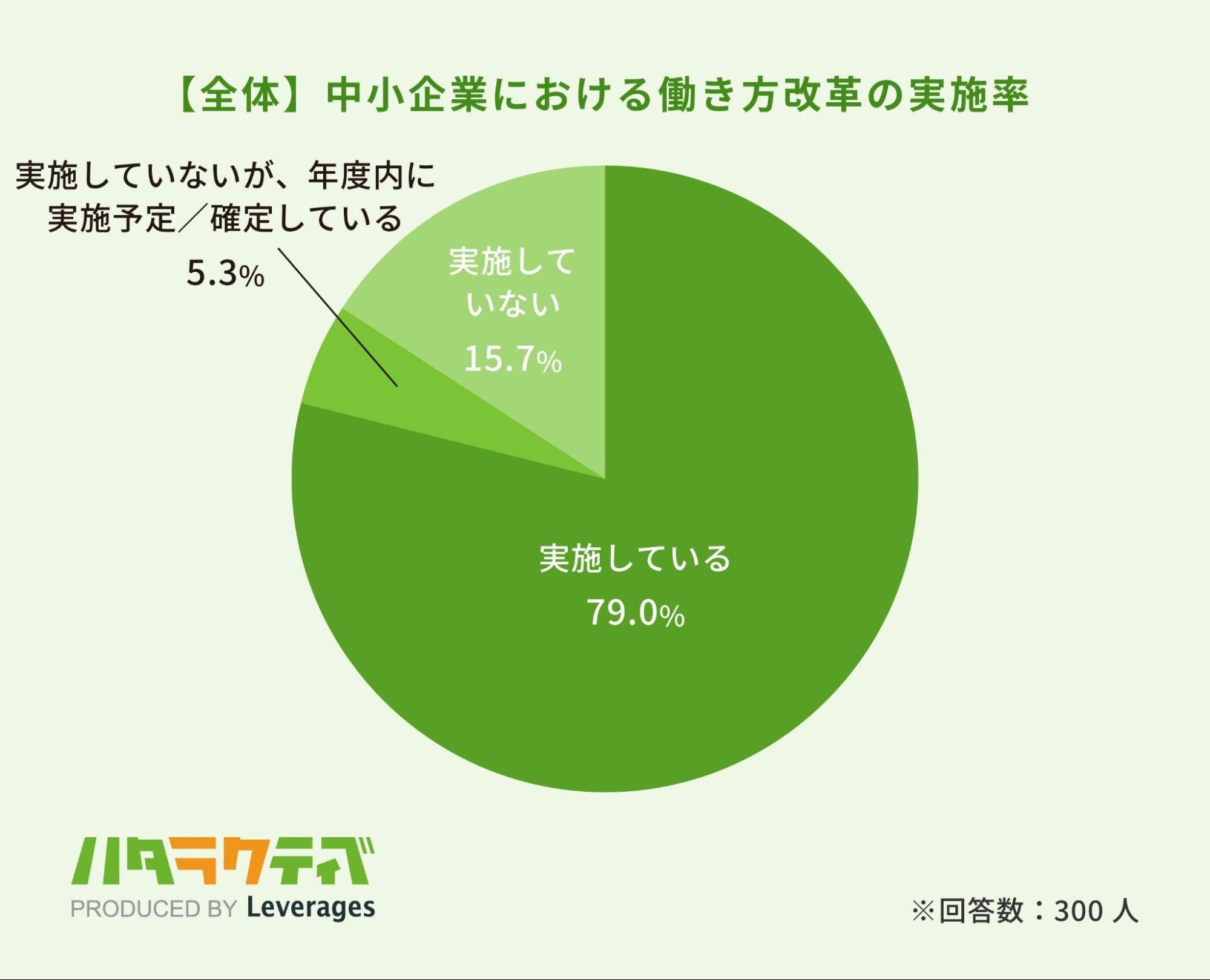 中小企業300社のうち、働き方改革に関する施策を「実施している」と回答した企業は全体の79%となりました。
