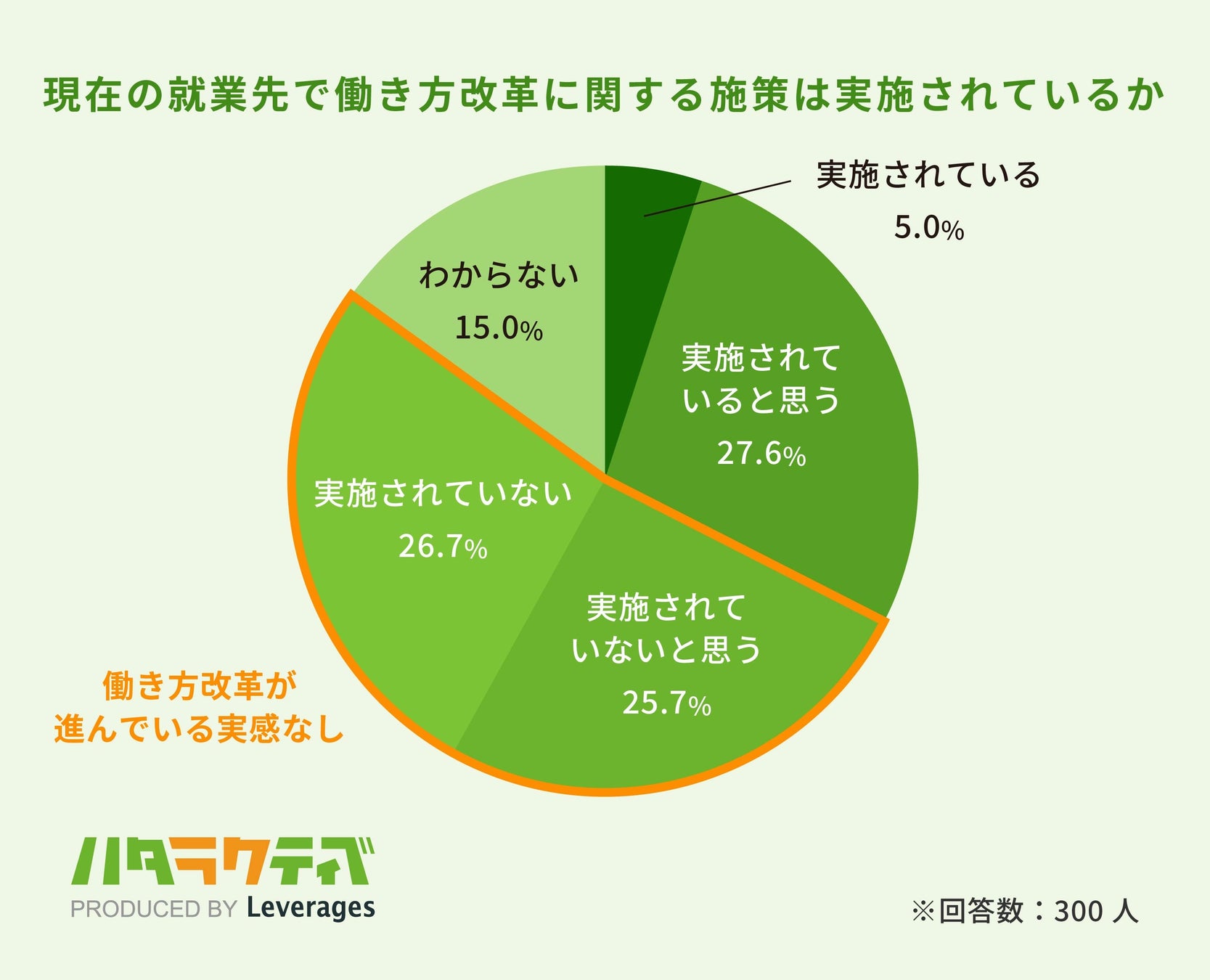 中小企業に在職中の正社員300名に対し、「現在の就業先で働き方改革に関する施策は実施されているか」と聞いたところ、「実施されていないと思う」「実施されていない」と回答した割合は半数以上にのぼりました。