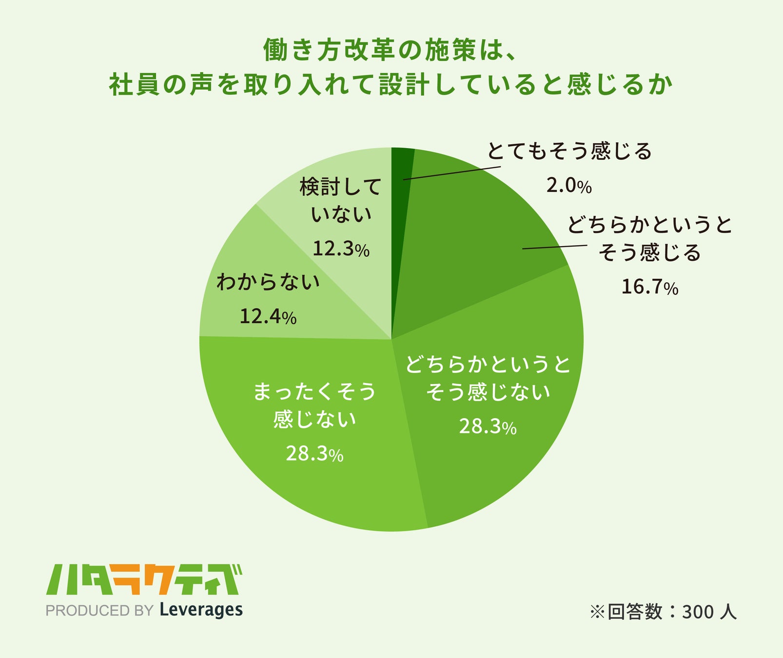 「働き方改革」の実施施策において、「現場の声を取り入れて設計している実感がある」と回答した社員は約2割となりました。