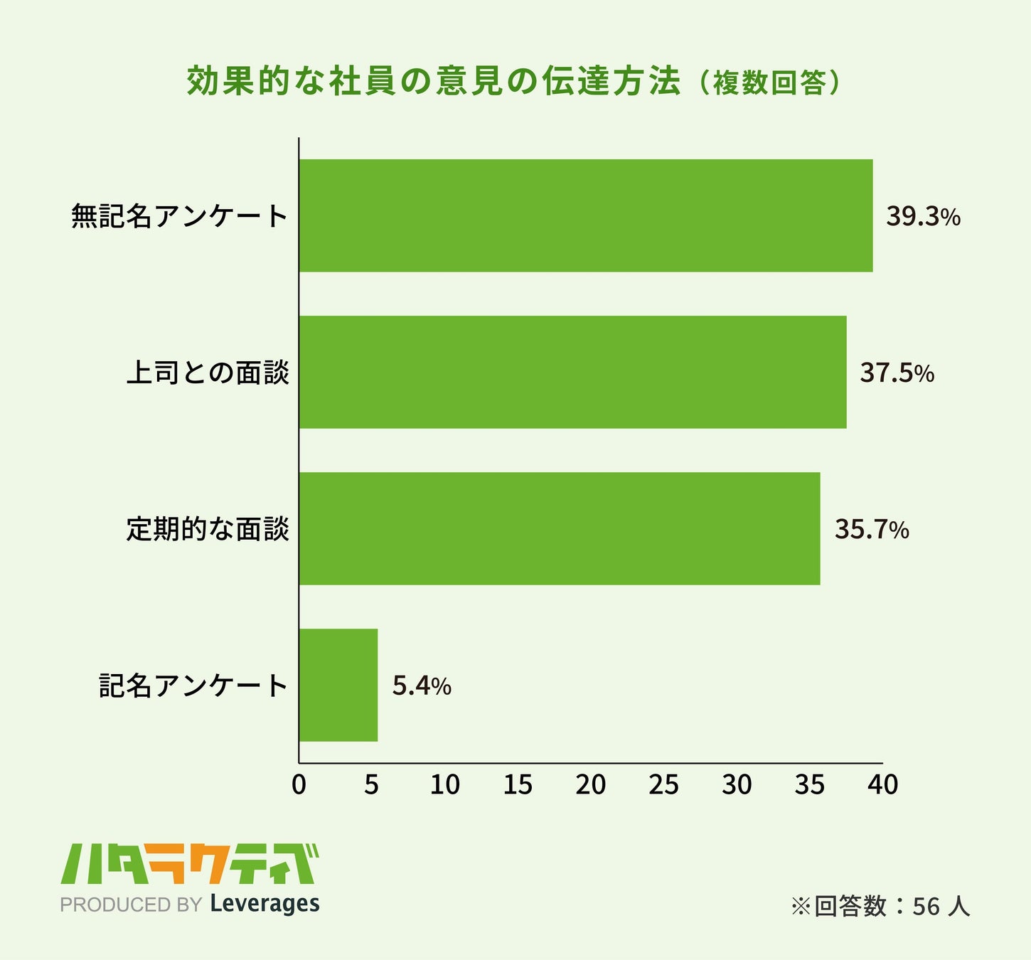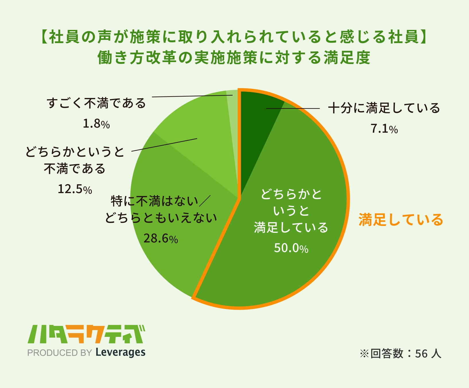 実施の施策が「社員の声を取り入れて設計している実感がある」と回答した社員に対し、効果的な意見の伝達方法について聞いたところ、最も多かったのは「無記名アンケート(39.3%)」となりました。次いで、「上司との面談(37.5%)」「定期面談(35.7%)」と続きます。「現場の声が反映されている実感がある」と回答した社員の「働き方改革」実施施策に対する満足度は高く、約6割が「満足している」と回答しました。