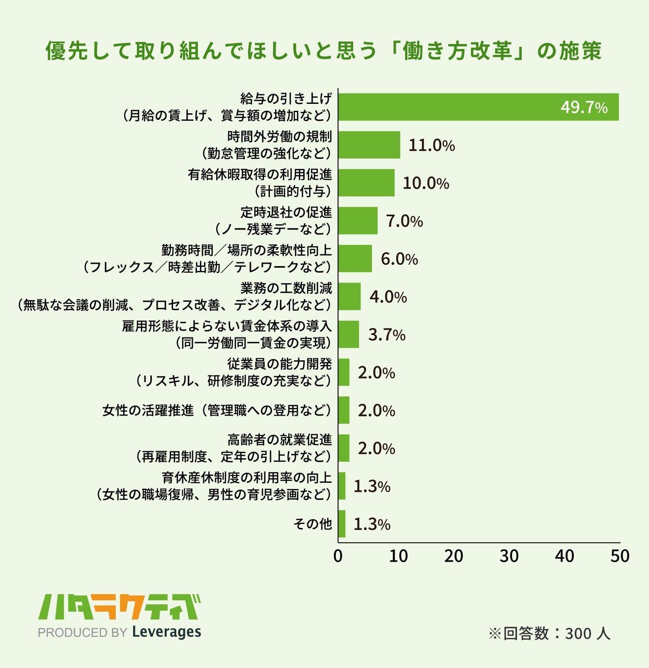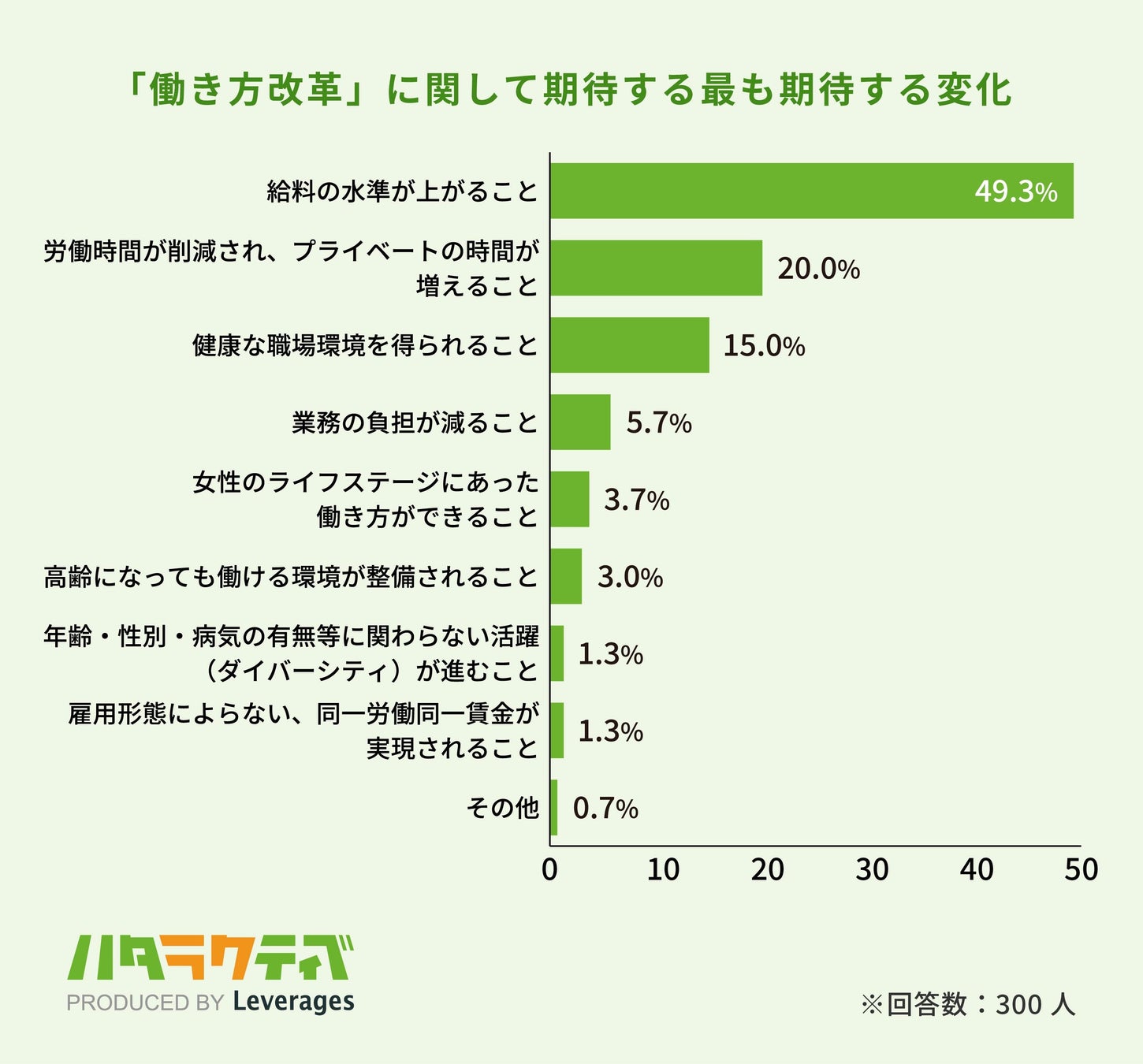 「働き方改革」に関して最も期待する変化の1位は、「給料の水準が上がること(49.3%)」でした。次いで「労働時間が削減され、プライベートの時間が増えること(20%)」と続きます。
