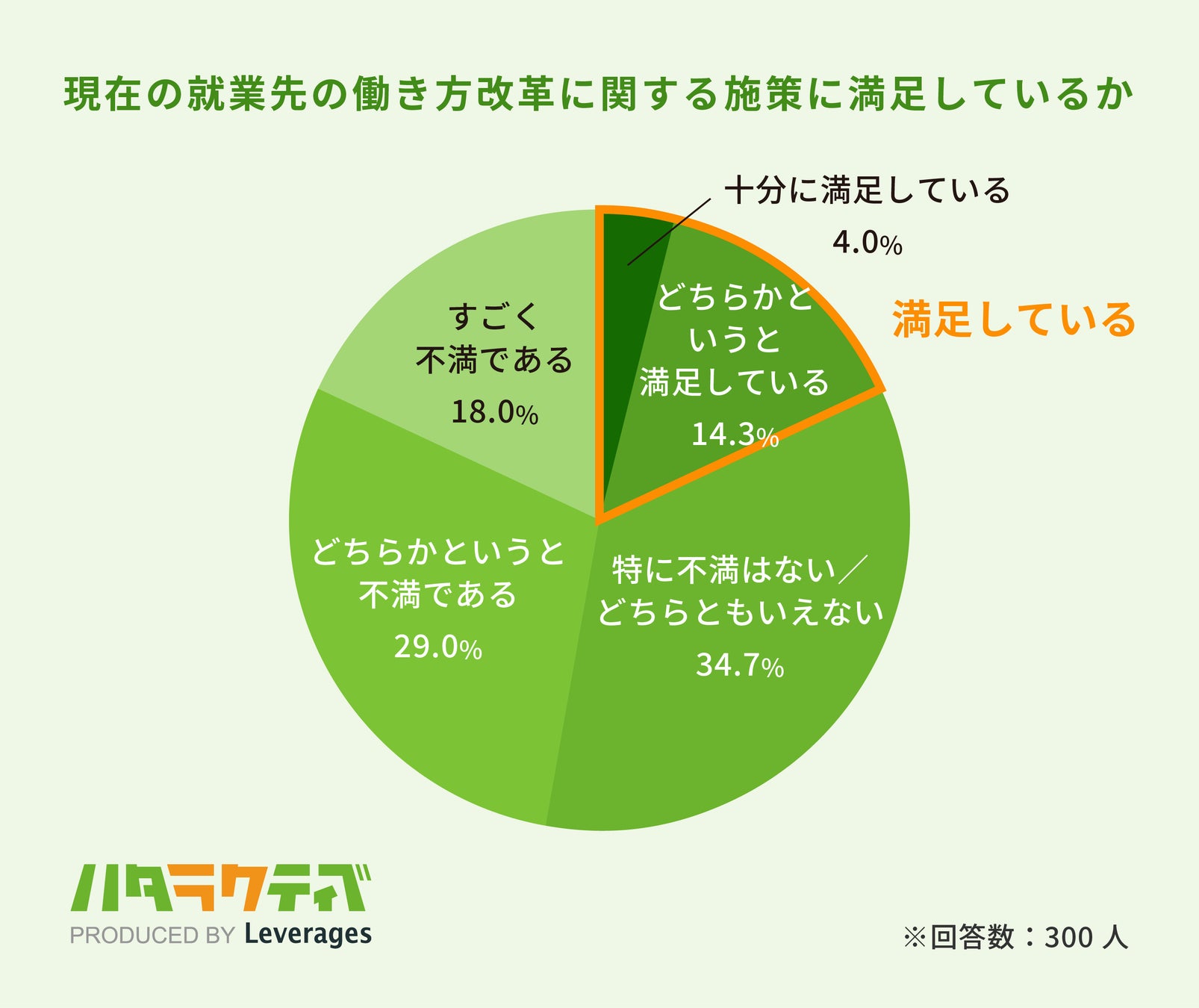 現在の就業先の働き方改革に関する施策に対して「満足している」と回答した割合は2割未満に留まる結果となりました。