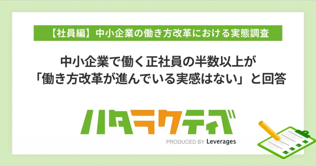 レバレジーズ株式会社が運営するフリーター・既卒・第二新卒向け就職支援サービス ハタラクティブ(https://hataractive.jp/ )は、中小企業*1に在職中の正社員300名を対象に、働き方改革の実態を調査しました。本調査は企業編*2・社員編に分けた発表となり、今回は社員編をお届けします。
