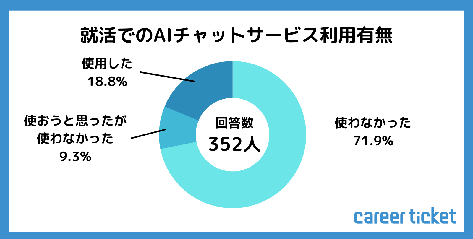 キャリアチケットに登録している大学生352人に対し、「AIチャットサービス(ChatGPTなど)を就活において使ったことがあるか」と聞いたところ、約2割の学生が「使用した(18.8%)」と回答しました。