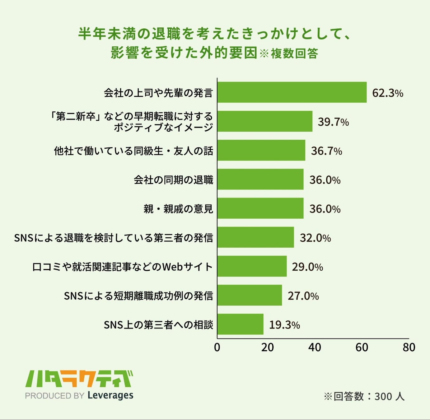 レバレジーズ株式会社が運営するフリーター・既卒・第二新卒向け就職支援サービス ハタラクティブ( https://hataractive.jp/ )は、2019年~2023年に大学を卒業し、新卒で入社した会社を半年未満で退職した経験がある男女300名を対象に、短期離職の実態を調査しました。