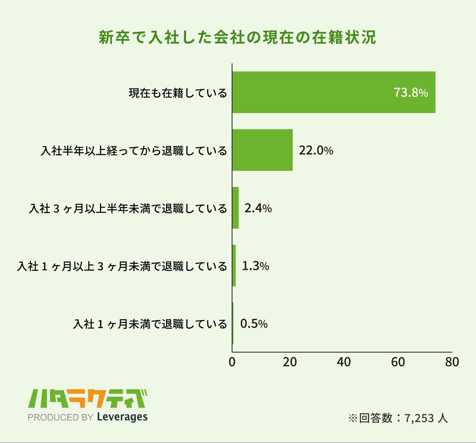 2019年〜2023年に大学を卒業し、新卒として会社に入社した男女7253名に対し調査を実施したところ、全体の約3割(26.2%)が新卒で入社した会社を既に退職していることがわかりました。そのうち、4.2%は入社してから半年未満で退職しています。