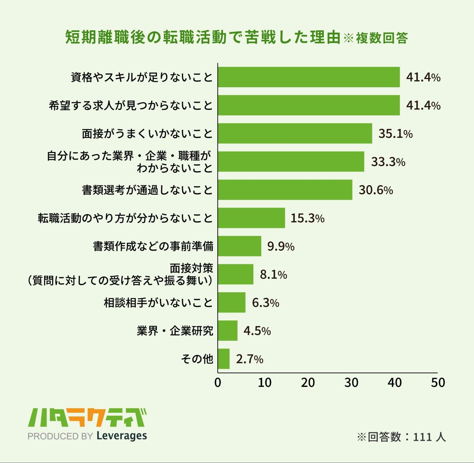 苦戦した理由で最も多かったのは、「資格やスキルが足りない(41.4%)」「希望する求人が見つからない(41.4%)」となりました。短期離職後の経歴やスキルでは、希望する条件や環境の求人は見つけることが困難であったり、見つかったとしてもその求人の応募条件に達していないケースが多いようです。