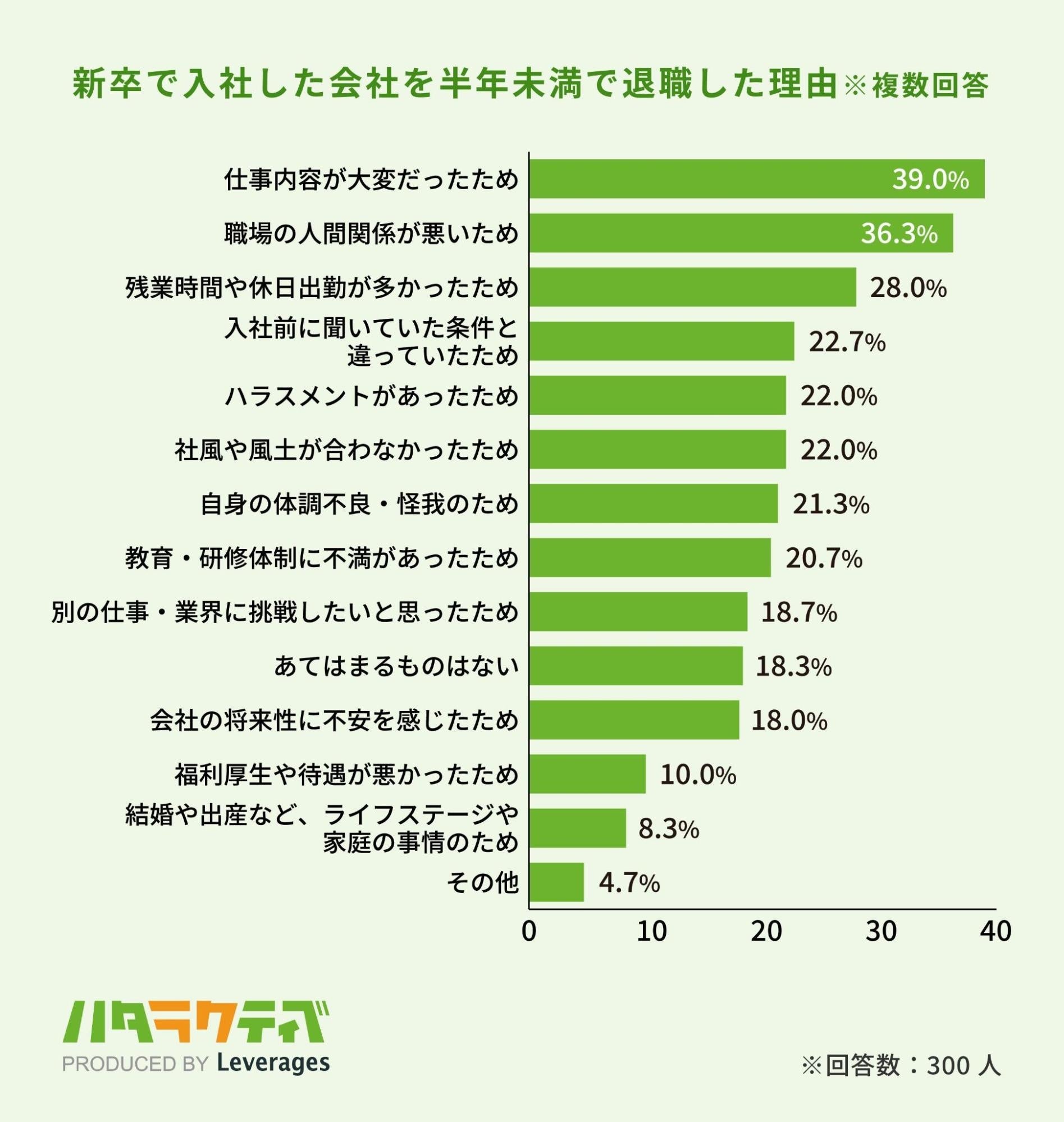 新卒で入社した会社を半年未満で退職した理由は、「仕事内容が大変だったため(39.0%)」が最も多く、次いで「職場の人間関係が悪いため(36.3%)」と続きます。