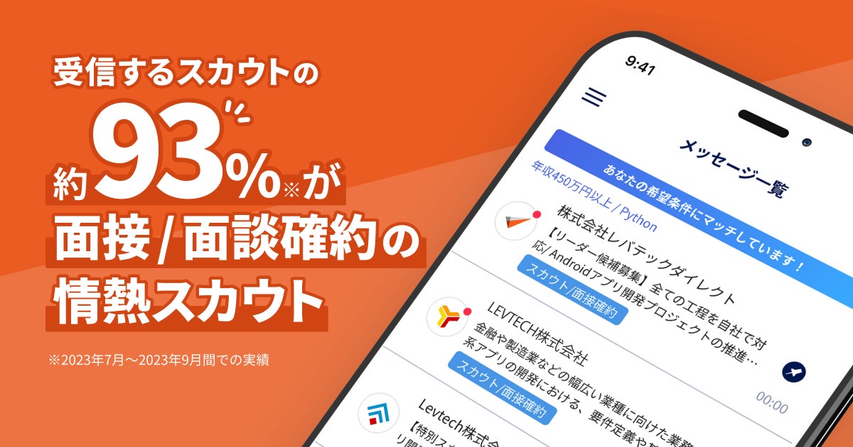 スカウトメッセージは一通ずつ企業が厳選して送信しています。全スカウトの約93%が面接/面談確約であるため、自身の経験やスキルに興味を持った企業から高品質なスカウトが受け取れます。