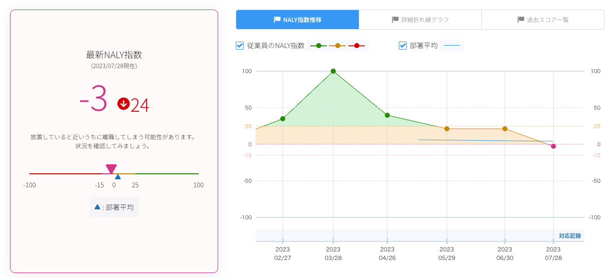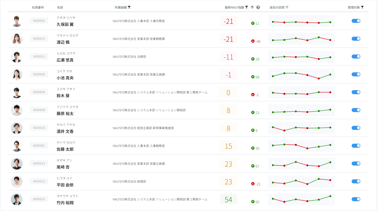 従業員の方に所要時間およそ2分の質問に回答してもらい、離職率と相関している「NALY指数」というモチベーションスコアを算出します。各従業員のNALY指数は一覧で確認ができ、数値が低下している従業員を洗い出すことが可能です。拡大を続ける組織の中においてもモチベーションが低下傾向にある従業員をいち早く見つけ、その従業員にあったアクションを起こすことで不本意な離職を防ぎます。
