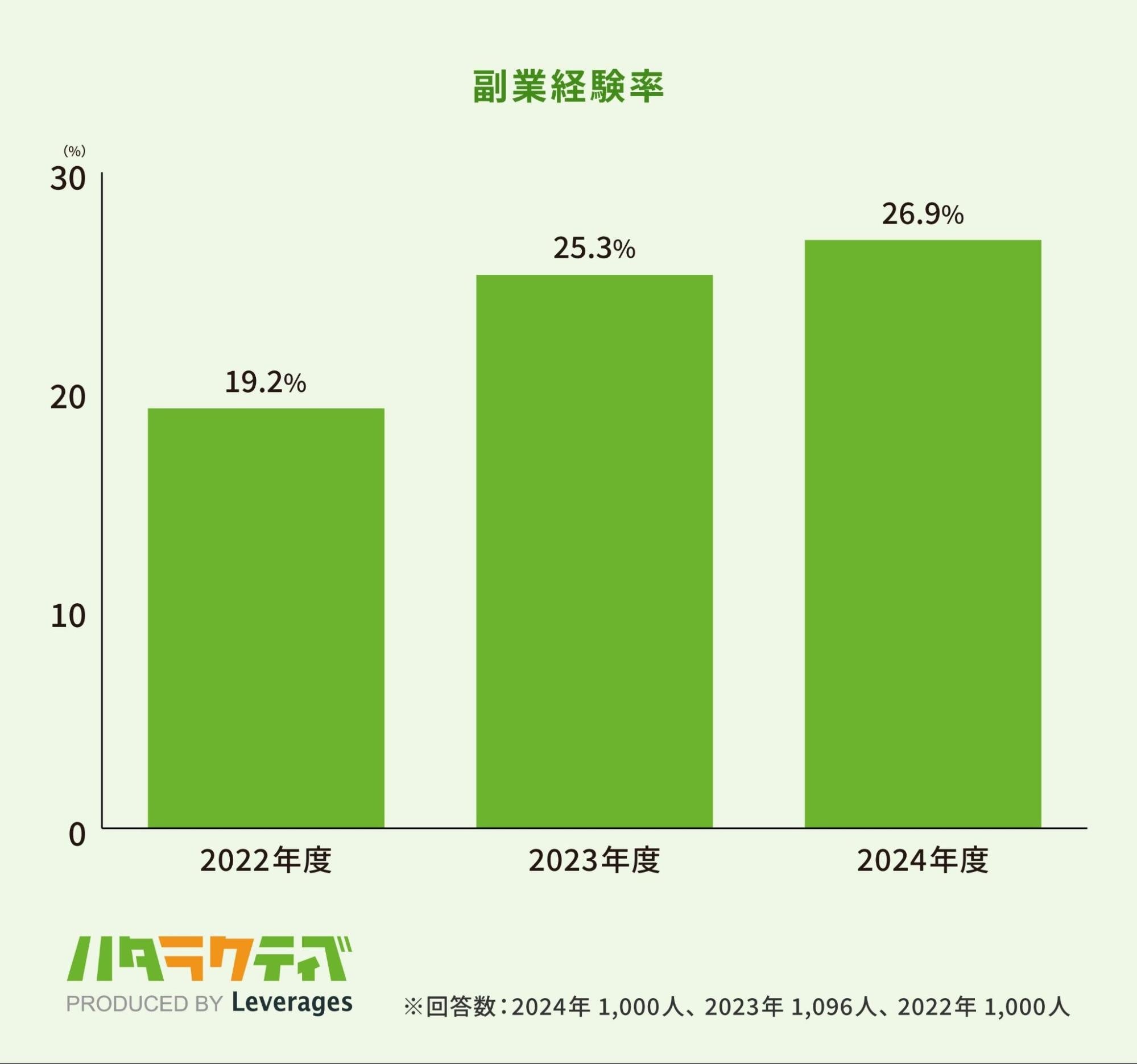 - 若年社員の約4人に1人が副業経験あり、2年前と比較して約8pt上昇