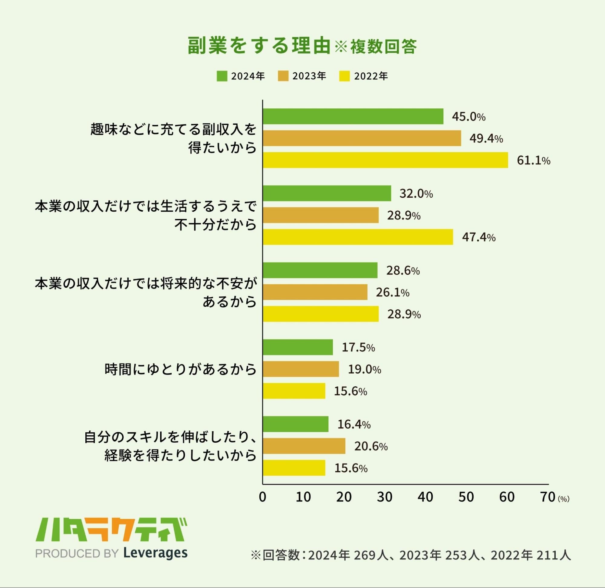 副業を行う理由として、1〜2割は「自分のスキルを伸ばしたり経験を得たい」と回答しています。副業を行うことが本業に活きるなど、企業にとってメリットになる可能性も考えられます。副業経験率が年々上昇していることから、今後副業を希望する若年社員は増加することが予想されます。副業の内容や頻度によって、企業は副業可否を柔軟に判断することが求められそうです。