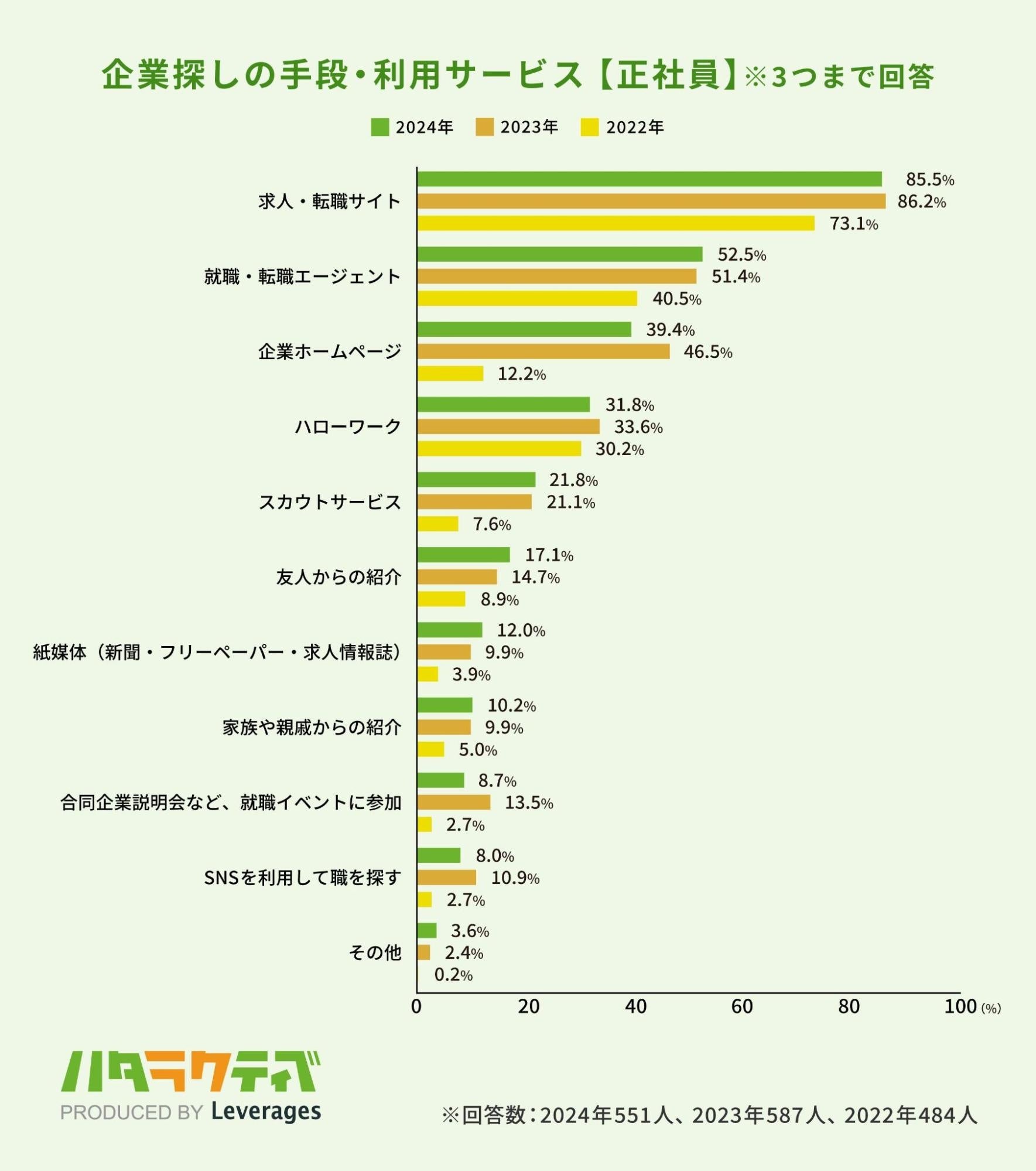 現在の若年社員は、1990年代から2000年代生まれのインターネットやデジタル機器がある環境で生まれ育ったデジタルネイティブ世代と言われており、情報社会で育ってきている世代です。「求人・転職サイト」「転職エージェント」など、複数のサービスの利用率が上昇していることから、現在の若年社員は転職活動において1つだけではなく複数のサービスを利用しながら、必要な情報を取捨選択していることが予想されます。