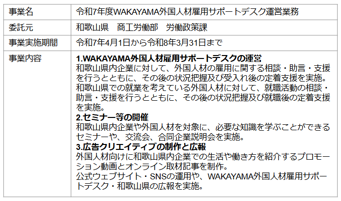 「令和7年度WAKAYAMA外国人材雇用サポートデスク運営業務」について