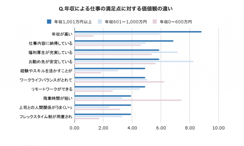 年収1,001万円以上の層は「年収が高い」「仕事内容に納得している」「経験やスキルを活かせている」といった点に満足していることがわかります。