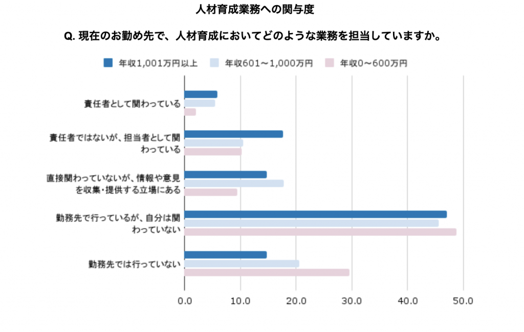 人材育成業務への関与は年収が高いほど積極的で、特に年収1,001万円以上の層は担当者や責任者として深く関わっています。年収0〜600万円の層は関与が少ない傾向にありますが、中堅層にも育成業務を分担させる仕組みを設けることで、育成の負荷を分散しながら後進の成長を支援することが可能です。