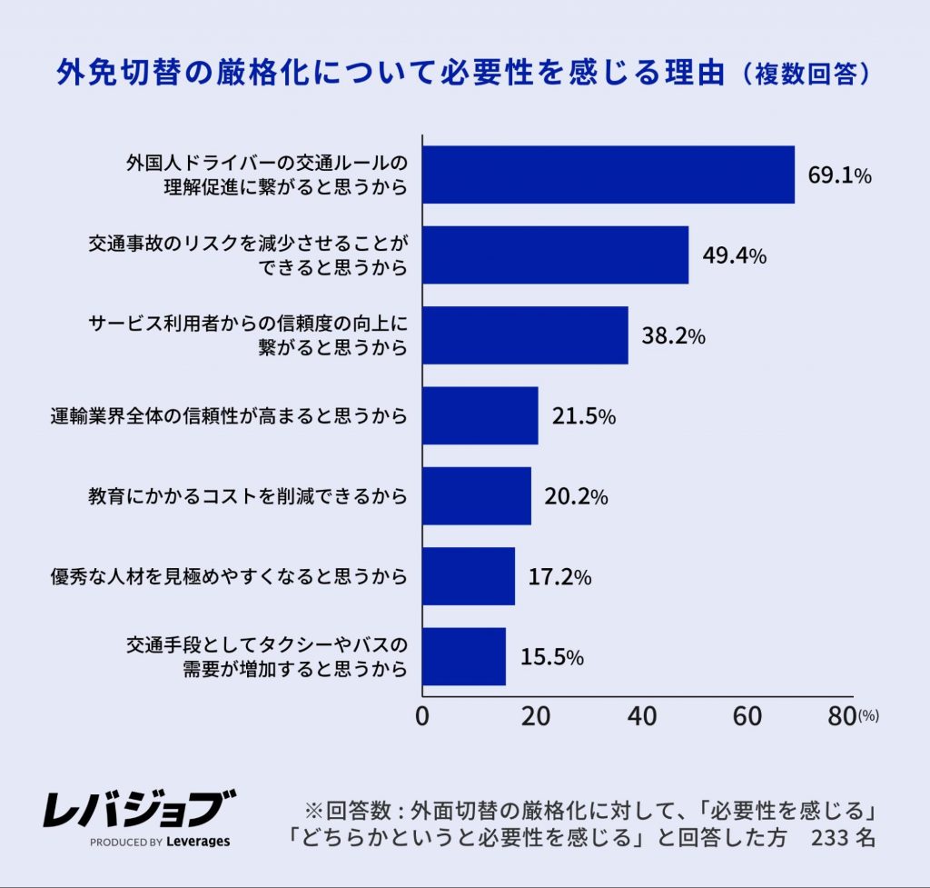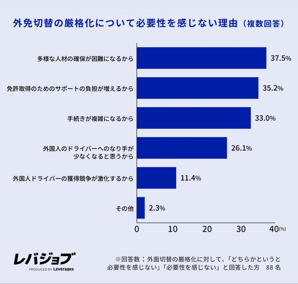 一方で、必要性を感じない理由として「多様な人材の確保が困難になるから(37.5%)」が最多となり、安全性に対する期待の一方で、外国人ドライバーの採用が難しくなり、人手不足が深刻化することを懸念していることが分かります。