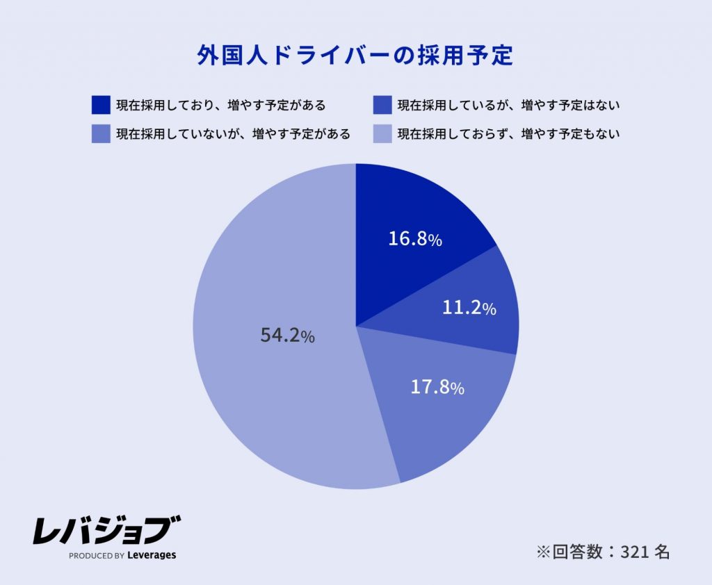 レバレジーズ株式会社が運営するエッセンシャルワーカー向けキャリア支援サービス「レバジョブ」(https://lp.levjob.jp/lp/01/1/a/00/00/00/00)は、物流・旅客事業のドライバー採用担当者・経営者321名を対象に、外国人ドライバーの採用に関する実態調査を実施しました。