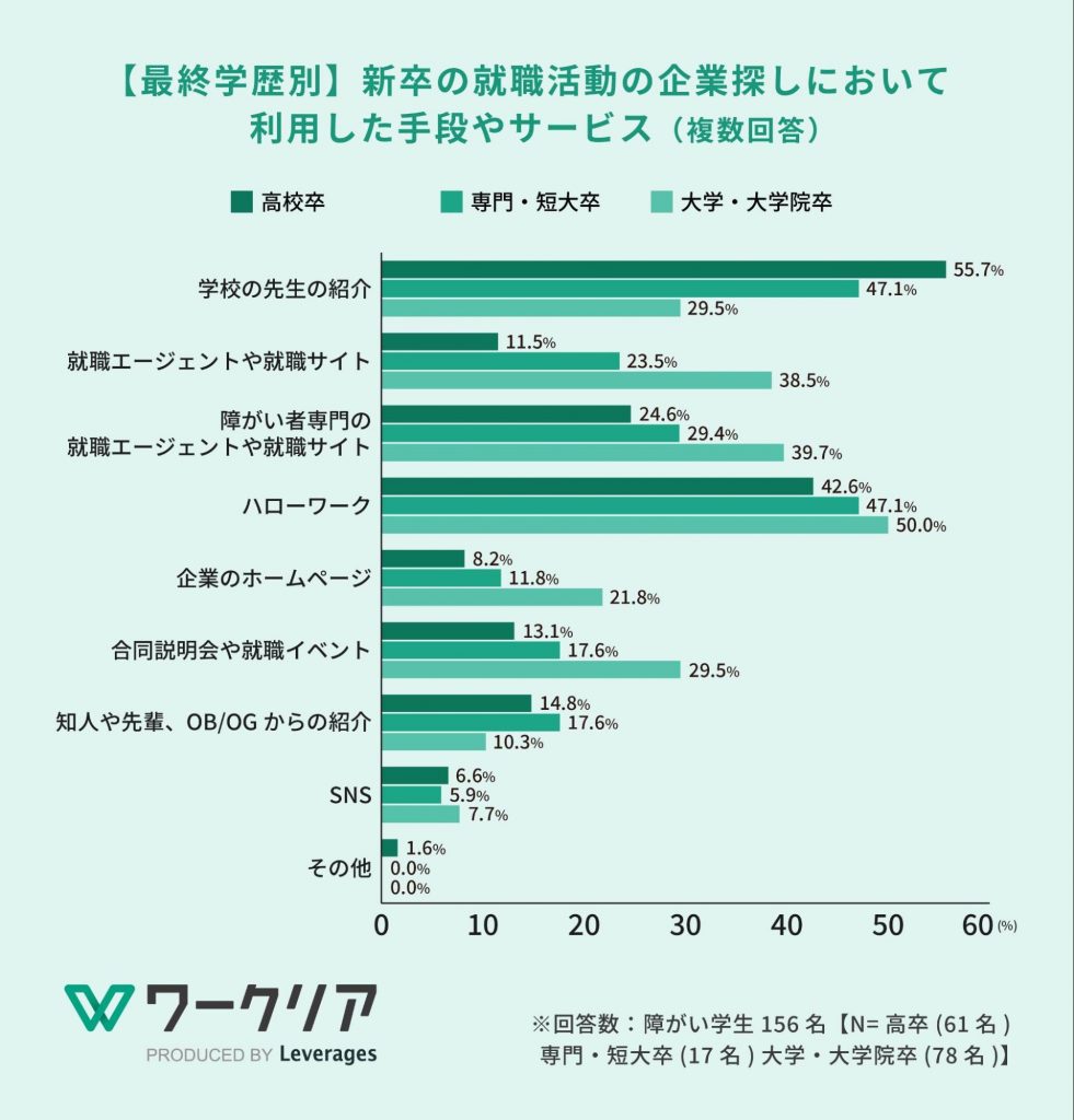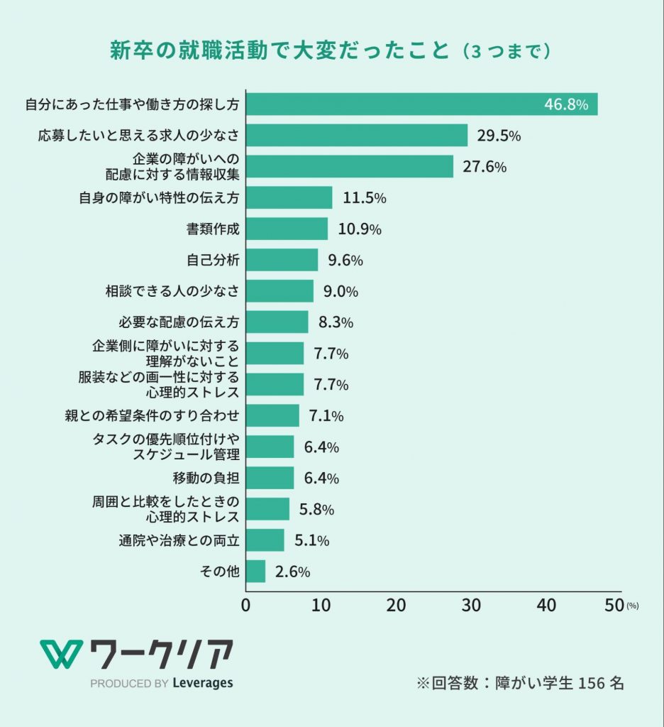 レバレジーズ株式会社が運営する障がい者就労支援サービス「ワークリア」( https://worklear.jp/ )は、障がいのある学生の就職活動の実態を明らかにするため、障がい者手帳を所持し※1、新卒での就職活動の経験がある156名を対象に、障がい学生の就職活動に関する実態調査を実施しました。