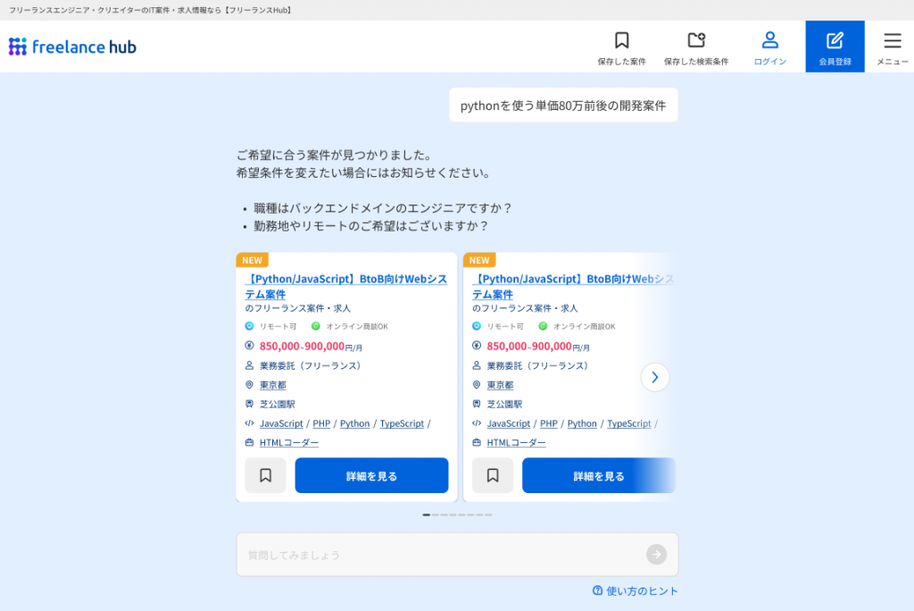 チャット形式を採用しているため、開発環境、単価、勤務条件など、さまざまな条件をユーザーの自然な言葉で伝えるだけで案件を絞り込むことが可能です 。